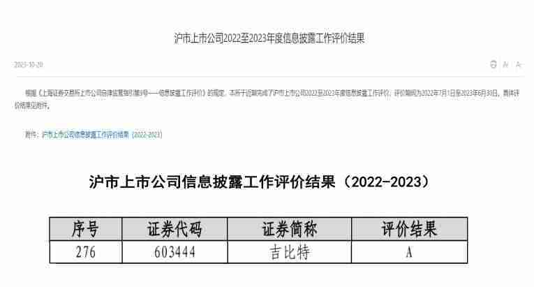 近日,,,,上海证券交易所(以下简称“上交所”)发布2022-2023年度信息披露工作评价结果。。J9.COM(股票代码::::603444)凭借规范的公司治理、、、高质量的信息披露以及良好的投资者关系管理再次荣获信息披露工作A级评价,,,公司连续两年获此殊荣。。。。
