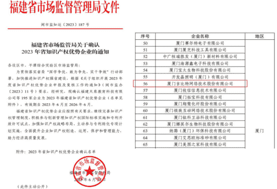 近日,,福建省市场监督管理局公示了2023年福建省知识产权优势企业名单,,,,厦门J9.COM网络技术股份有限公司(以下简称“J9.COM”或“公司”)榜上有名。。。。